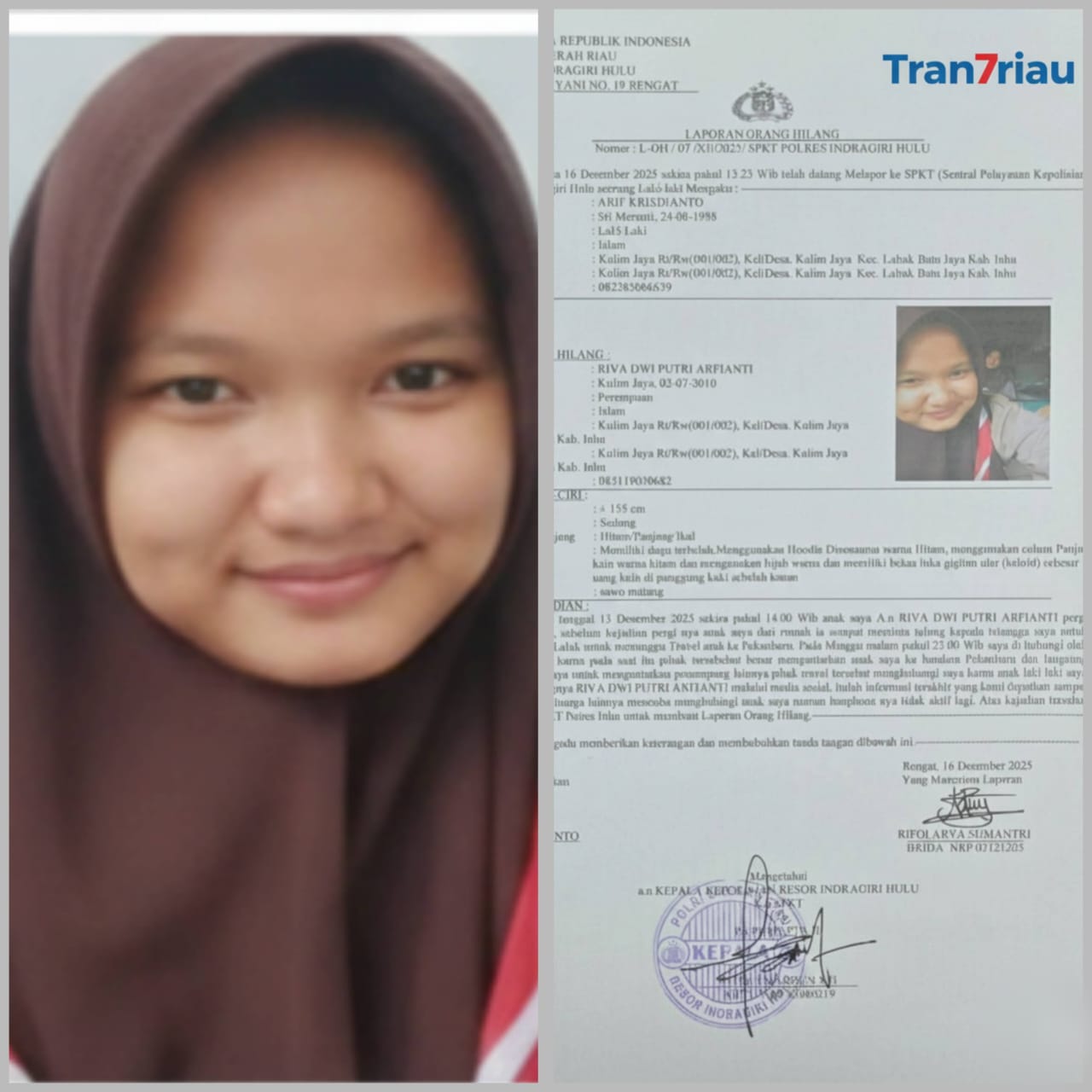 RENGAT, | khabarpelalawantv.my.id — Seorang remaja putri bernama Riva Dwi Putri Arfianti (16), warga Kelurahan Kulim Jaya, Kecamatan Lubuk Batu Jaya, Kabupaten Indragiri Hulu (Inhu), Provinsi Riau, dilaporkan hilang kontak sejak Sabtu, 13 Desember 2025. Hingga kini, keberadaan korban belum diketahui dan pihak keluarga telah melaporkan kejadian tersebut ke kepolisian.